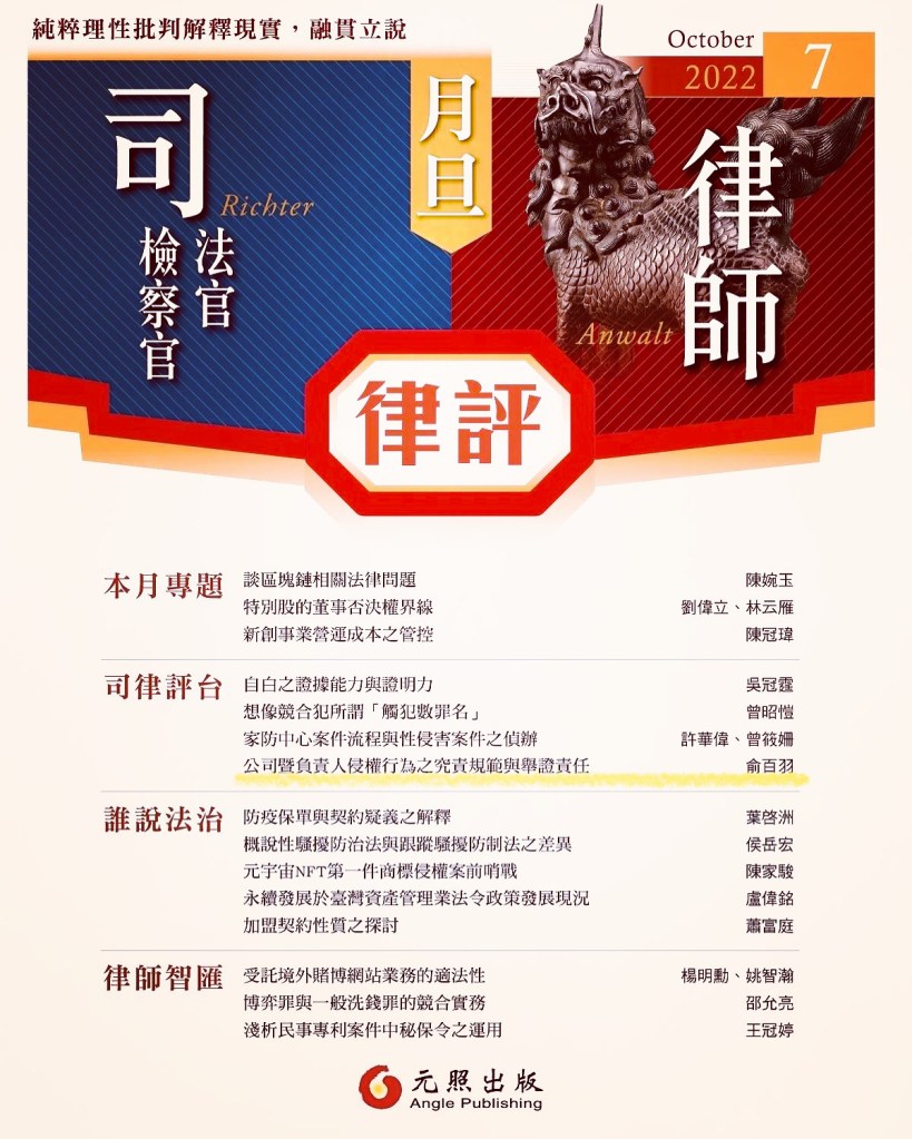 《月旦律評》:〈公司曁負責人侵權行為之究責規範與舉證責任〉